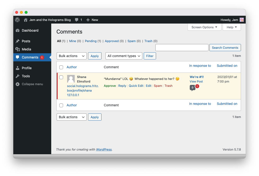 After a delay (Friendica queues up notifications for delivery on a schedule), the comment appears in Wordpress, ready for Jem to approve or discard: