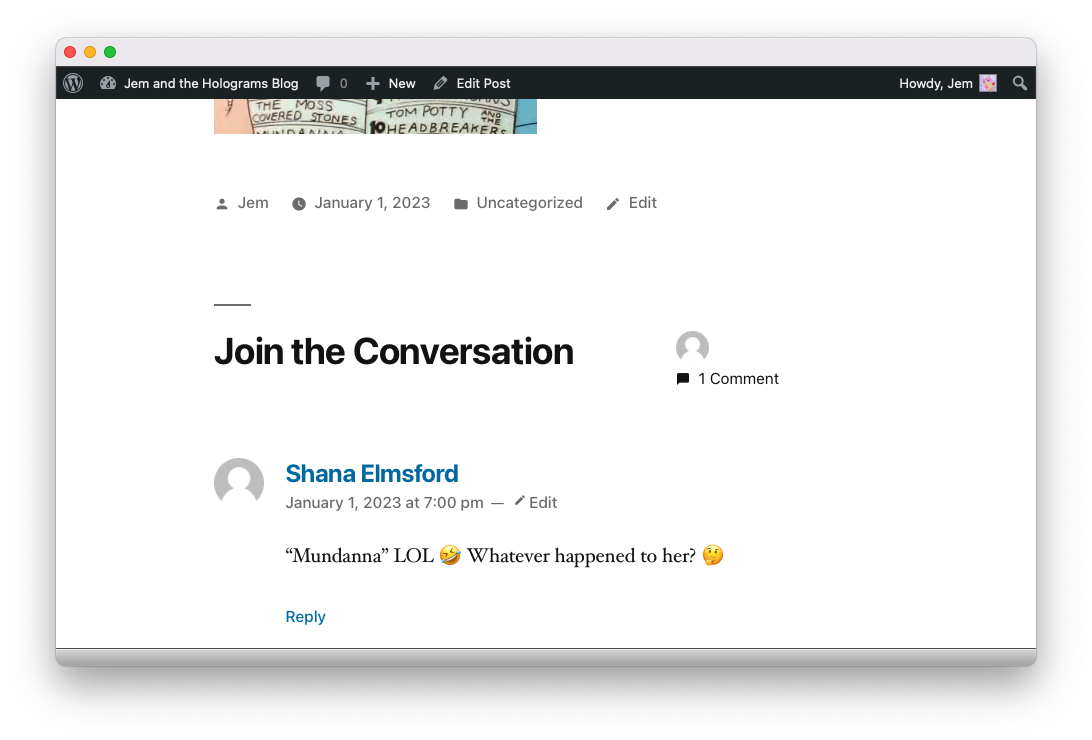 Jem can approve this comment too. But here's a more significant missing feature of the ActivityPub plugin: it does not send this comment to Shana. Only articles get sent over ActivityPub, not comments. So Shana will never see this reply, unless she thinks to visit the blog directly.